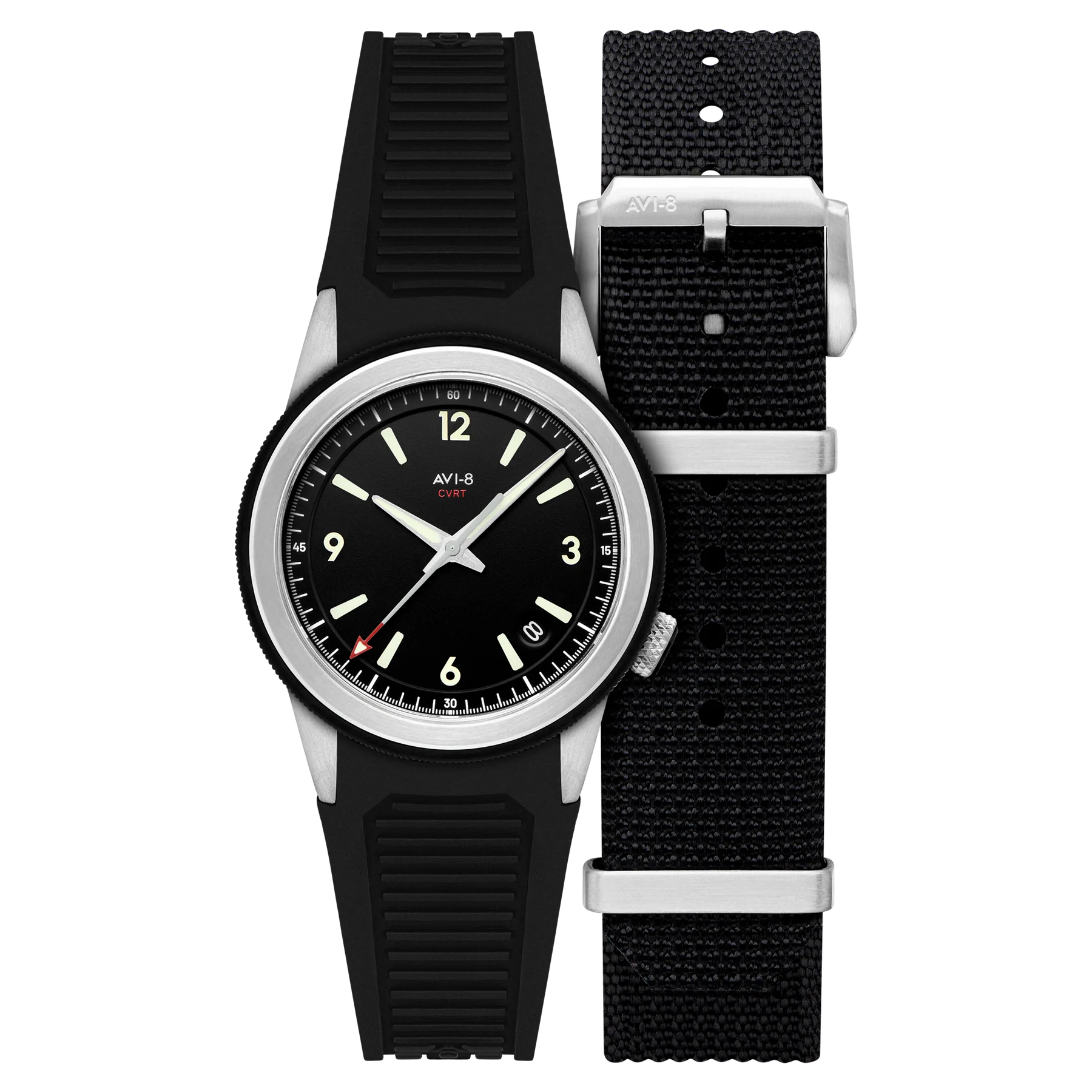 O AVI-8 CVRT 3775A Night Shadow AV-4141 nasce da colaboração entre a AVI-8 e a Worn & Wound Creative Services, reunindo duas comunidades apaixonadas por relojoaria em um projeto concebido por entusiastas para entusiastas. O mostrador preto reforça o conceito Night Shadow com uma estética tática, sóbria e altamente legível, evocando instrumentos de missão e a linguagem visual da aviação militar.