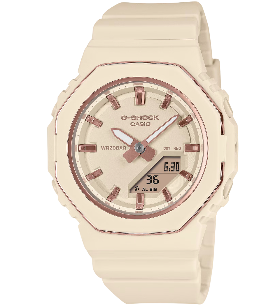 O tom bege adiciona um caráter urbano sofisticado ao modelo, dialogando com tendências atuais de design minimalista e paletas neutras. A combinação com tons em rose nos ponteiros e índices torna o relógio extremamente versátil, ideal para quem deseja um G-SHOCK com identidade forte, mas com uma leitura visual mais discreta e refinada, sem perder o espírito aventureiro da linha.