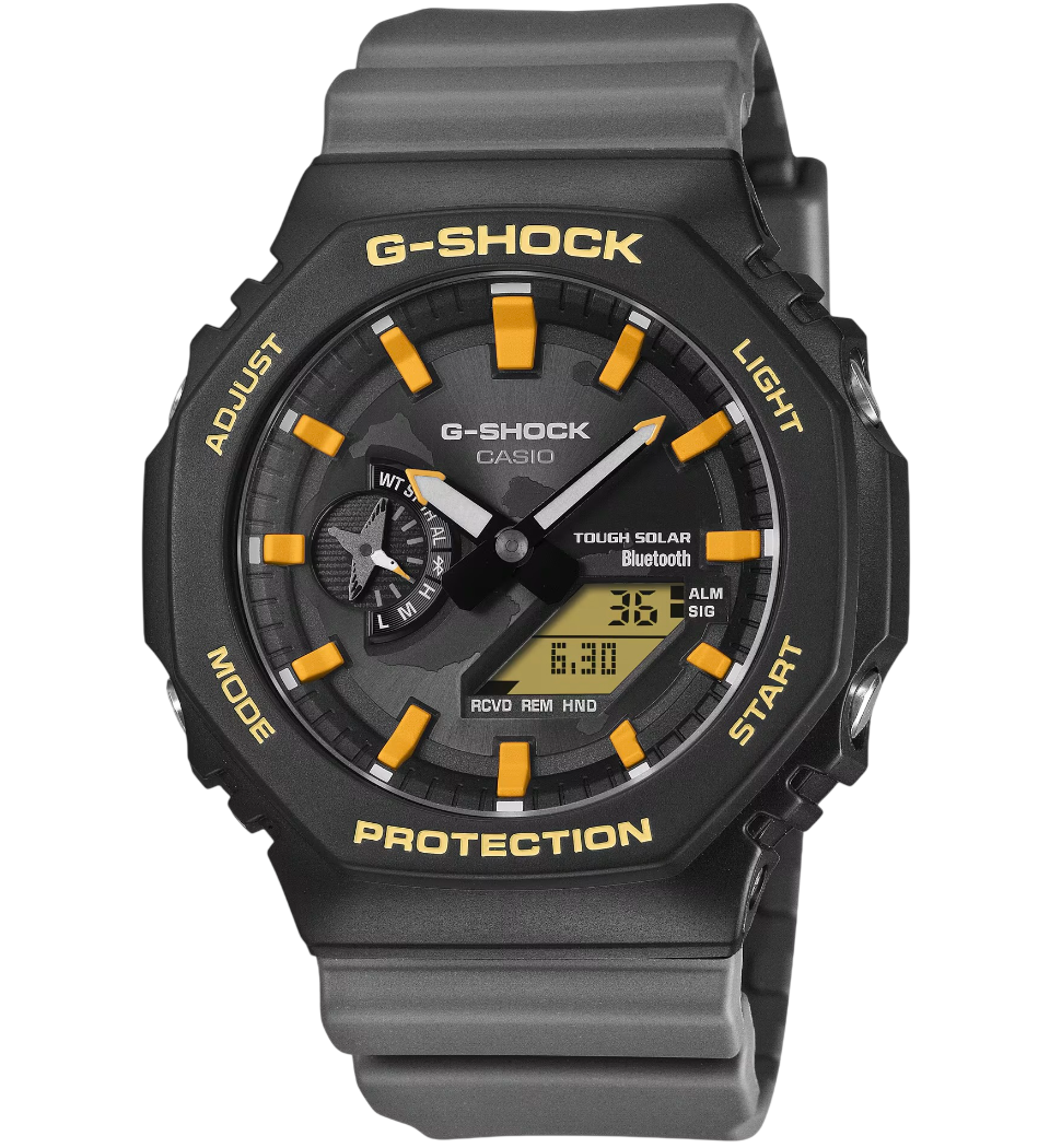 A proposta científica se estende aos materiais e às funções do relógio. Baseado no GA-B2100, o modelo conta com carregamento Tough Solar e conectividade com smartphone, reduzindo a dependência de trocas de bateria e ampliando sua vida útil. A pulseira e o aro são produzidos com resina de base biológica, derivada de recursos orgânicos renováveis, reforçando o compromisso ambiental da colaboração. Visualmente, o mapa das Ilhas Galápagos aparece no mostrador, enquanto detalhes em amarelo remetem ao bico do albatroz. O formato do ponteiro do indicador e o laço da pulseira evocam o movimento elegante das asas em voo, criando uma conexão direta entre biologia, física do voo e design.