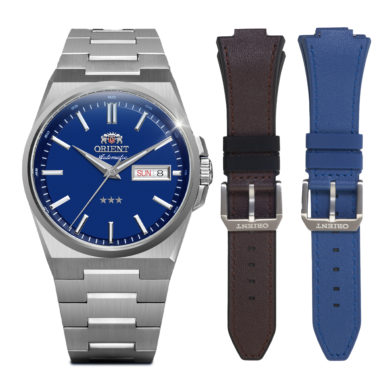 Seu mostrador azul royal texturizado captura a luz com profundidade e elegância, conferindo um visual refinado sem abrir mão da personalidade esportiva. Em mais um capítulo de inovação da linha, a pulseira em aço deste modelo traz um elo inicial de 5 mm — menor que os demais de 8 mm — permitindo um ajuste muito mais preciso ao pulso. Essa versão acompanha como adicional duas pulseiras integradas em marrom e azul com sistema de troca rápida, representando praticidade e conforto: externamente em couro, preserva o visual clássico e refinado, enquanto sua face interna em silicone texturizado proporciona maior aderência, resistência à umidade e conforto prolongado no uso diário. Essa combinação inteligente entre couro e silicone cria uma experiência mais ergonômica e versátil, perfeita para quem transita com naturalidade entre ambientes urbanos e momentos de lazer em movimento. O aro interno com marcadores adiciona um senso de movimento contínuo, reforçando a presença dinâmica no pulso. O resultado é tradição 3 Estrelas em uma linguagem contemporânea pensada para colecionadores e apaixonados por relógios.