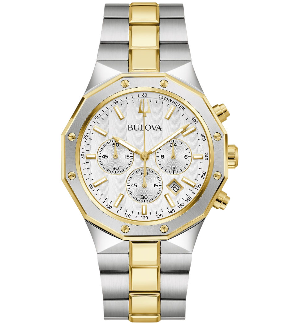 O Bulova Classic Prestige 98B450 apresenta um design ousado e sofisticado, combinando presença marcante e refinamento em cada detalhe. A caixa com acabamento IP Gold, luneta geométrica e cristal de safira antirreflexo reforçam o caráter premium desta peça.