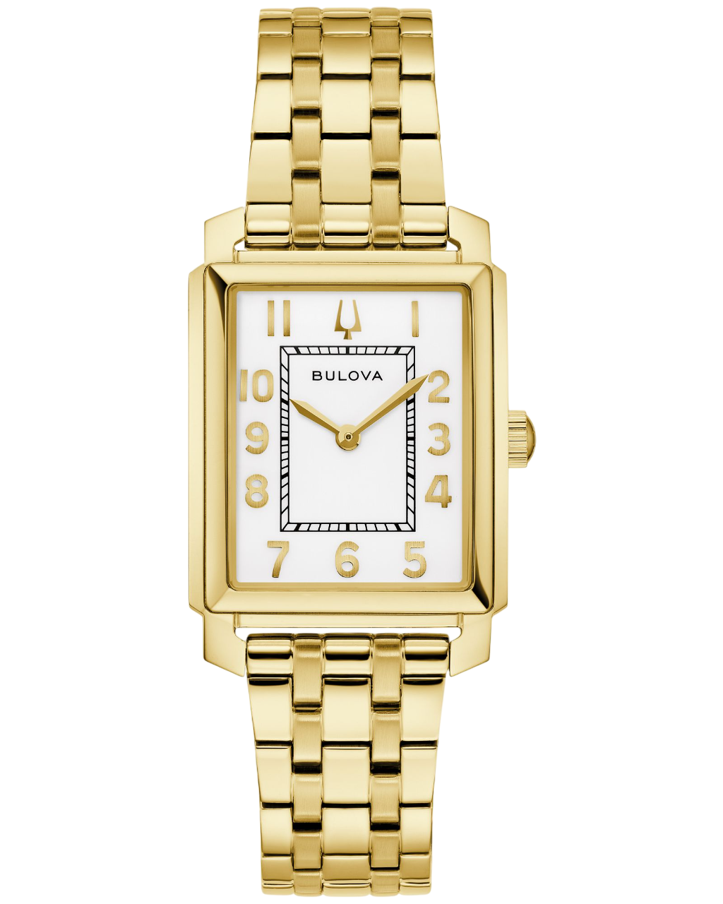 Este novo Bulova Sutton 97L186 adiciona uma elegância luxuosa à coleção, com caixa retangular em aço inoxidável com IP Gold que exala sofisticação e estilo atemporal.