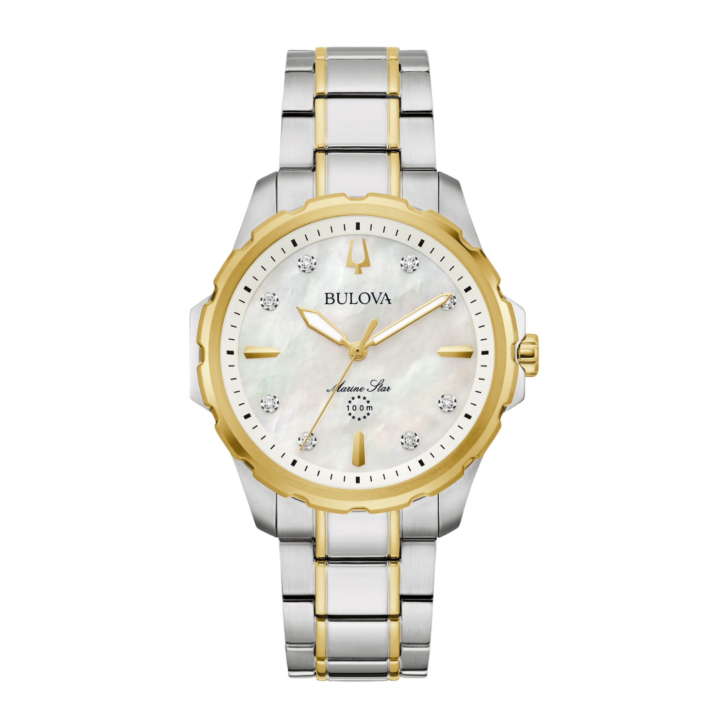 Seu mostrador em madrepérola cria um jogo de luz suave e elegante, valorizado por quatro diamantes aplicados nos índices e pelo icônico diapasão da Bulova posicionado às 12 horas, assinatura histórica da marca. Os detalhes em dourado presentes no bezel, na coroa, nos ponteiros e nos elos centrais da pulseira criam um contraste sofisticado com o aço, resultando em um visual refinado, feminino e ao mesmo tempo esportivo, fiel ao espírito da linha Marine Star. A pulseira com fecho borboleta proporciona um fechamento seguro e discreto, mantendo a continuidade visual do bracelete e coerência à proposta de elegância.