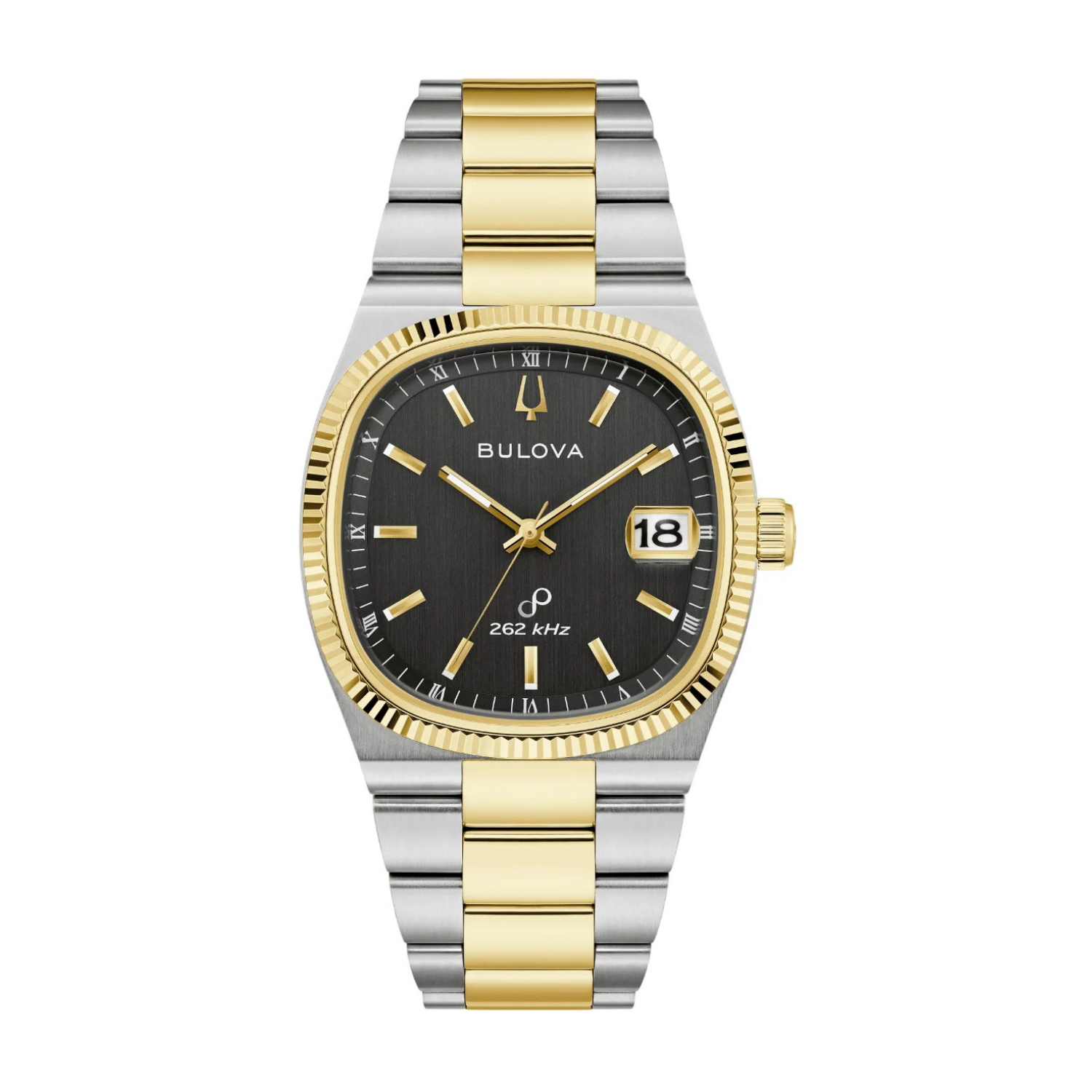 O Bulova Super Seville 98B458,Inspirado no icônico Bulova Super Seville Day-Date da década de 1970, resgata o charme vintage com um toque contemporâneo. Sua estética retrô é marcada pela caixa em formato de TV, que se integra de forma fluida à pulseira de três elos em aço inoxidável, resultando em uma presença elegante e distinta no pulso.