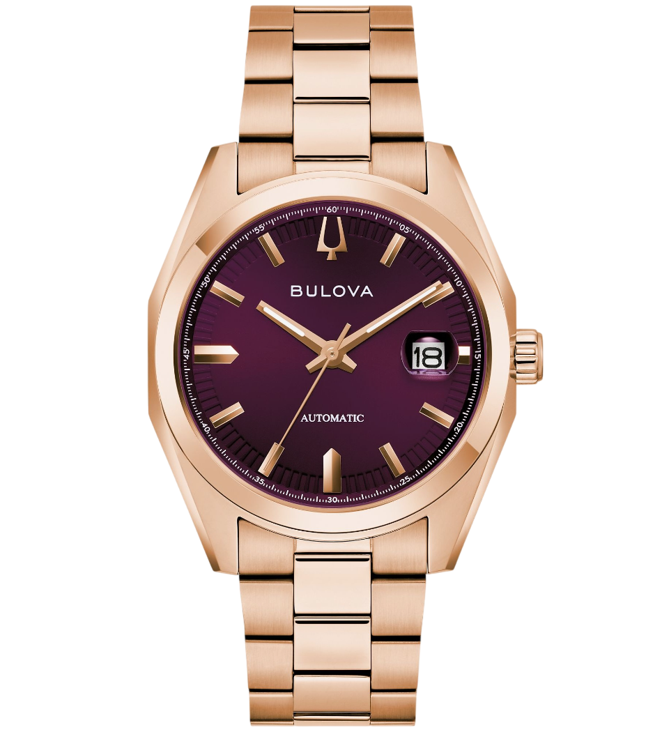 O Bulova Surveyor Automático 97B234 é a expressão da elegância contemporânea, combinando design refinado, proporções equilibradas e um belo mostrador roxo com efeito sunburst que reflete luz e sofisticação. Suas linhas facetadas e acabamento rose unem polimento e escovamento com harmonia, resultando em uma presença marcante no pulso.