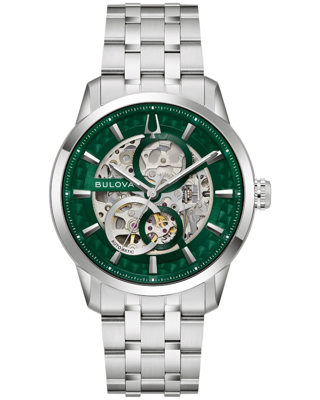 O Bulova Sutton Automático 96A329 é uma peça que revela a verdadeira arte da relojoaria. Seu mostrador esqueleto com anel interno verde permite admirar a complexa mecânica interna, criando uma harmonia entre engenharia e elegância.