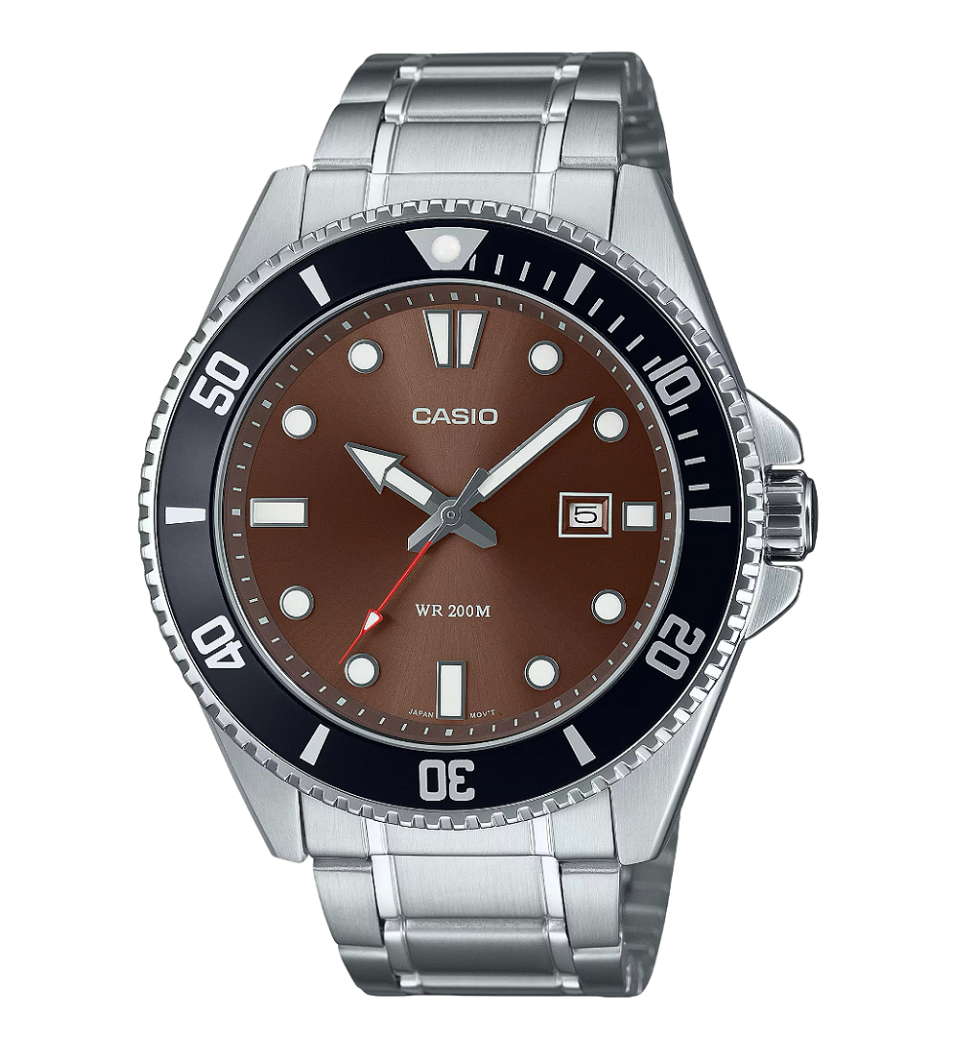 O Casio Duro MDV-107 apresenta um mostrador marrom elegante que reforça sua proposta de robustez esportiva, mantendo o estilo clássico que tornou a série Duro tão popular. Seu visual equilibrado combina funcionalidade e presença no pulso, ideal para quem busca um relógio forte e versátil.