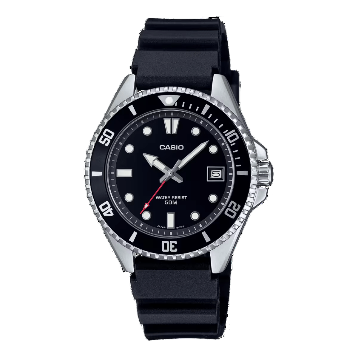 O Casio Duro MDV-10 apresenta um mostrador preto de leitura clara que reforça sua proposta de praticidade e estilo esportivo. Seu tamanho compacto e visual limpo fazem dele uma opção perfeita para quem busca relógio leve, versátil e discreto para o dia a dia.