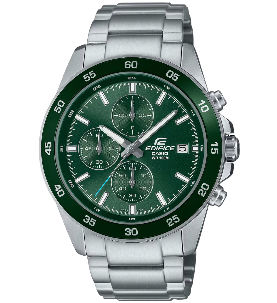 O relógio Casio Edifice EFR-526D-3AVUDF reflete o espírito dinâmico da linha Edifice, unindo design esportivo e refinamento urbano. Seu mostrador verde confere elegância contemporânea, destacando os submostradores do cronógrafo com acabamento contrastante.