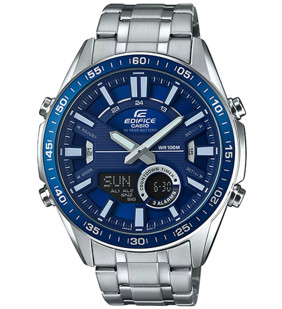 O relógio Casio Edifice EFV-C100D-2AVDF combina o estilo clássico da linha Edifice com a praticidade moderna de um modelo analógico-digital. Seu mostrador azul tridimensional de duas camadas cria um design dinâmico e esportivo, ideal para quem busca funcionalidade com elegância. A bateria de 10 anos garante tranquilidade e longa durabilidade.