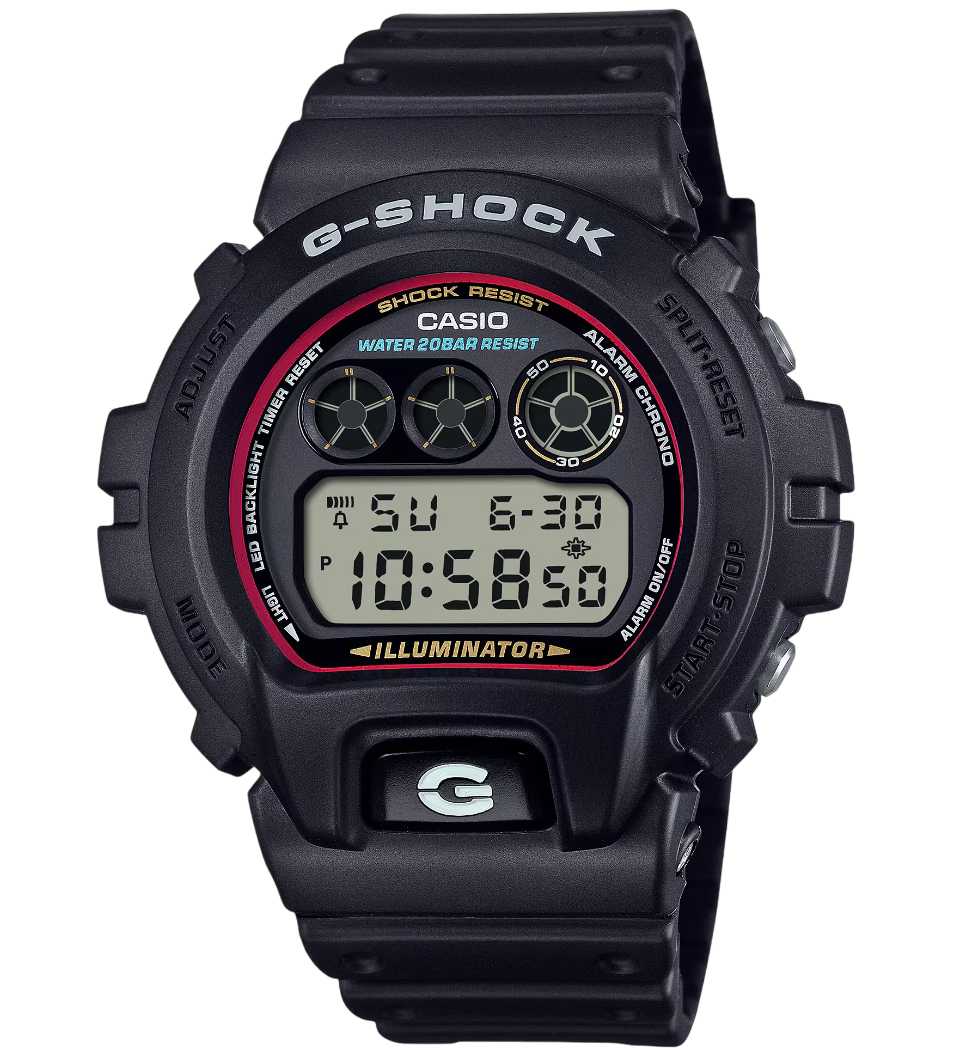Um verdadeiro ícone cultural atemporal, admirado por gerações. Seu esquema de cores original é fielmente recriado, agora com detalhes em vermelho representando a paixão do G-SHOCK por superar limite azul, que simboliza sua excepcional resistência à água, e amarelo, evocando sua incomparável resistência a impactos.