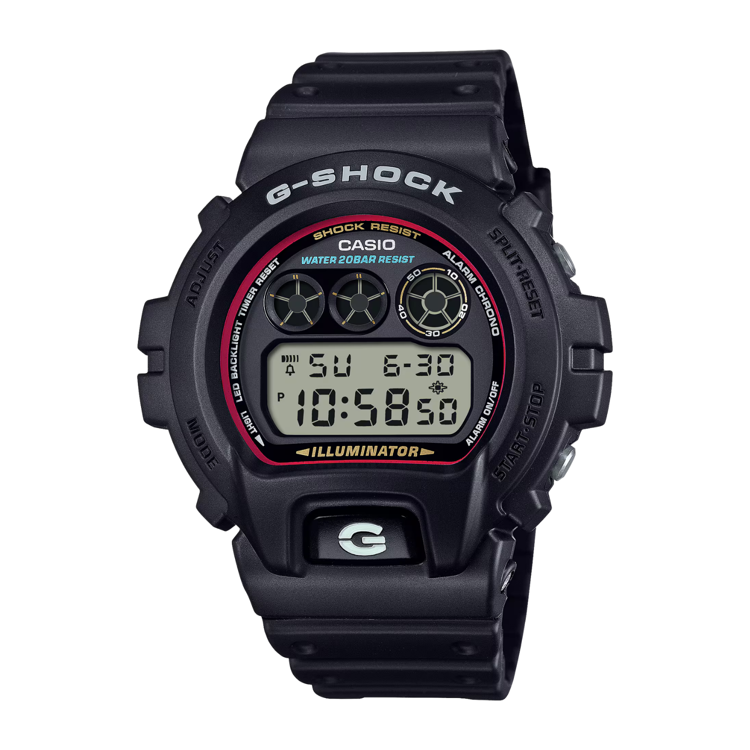 Nesta edição especial, o clássico ganha um contraste moderno em preto e vermelho, combinando o preto fosco da linha G-SHOCK com uma linha vermelha vibrante interna, criando um efeito monocromático arrojado e minimalista. o DW-6900 reafirma sua versatilidade ao reinterpretar uma estética urbana contemporânea sem abrir mão de sua herança cultural.