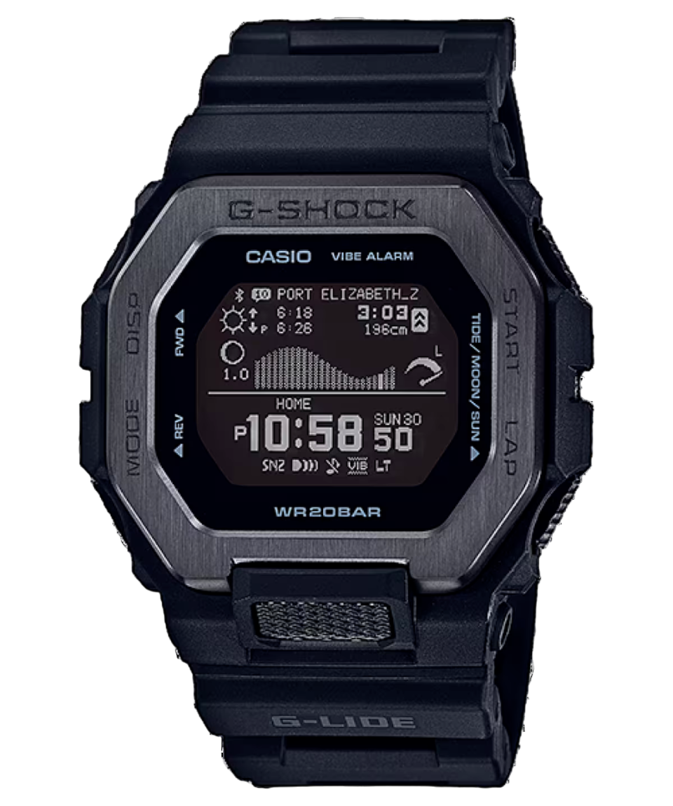 O Casio G-SHOCK G-LIDE GBX-100 é feito para surfistas e fãs de esportes radicais, oferecendo conectividade com smartphones para acessar mais de 3.300 pontos de surfe, com dados de marés, fases da lua e horários de nascer/pôr do sol. Seu display LCD de alta resolução (MIP) exibe gráficos claros e rastreia métricas de surfe e treino, como distância, ritmo, cadência e voltas. A construção robusta, com moldura de resina e metal, garante resistência, enquanto a pulseira de uretano biológico oferece conforto e escoamento de água e suor. Disponível em azul oceano e bege arenoso, une estilo e funcionalidade para quem vive na adrenalina.