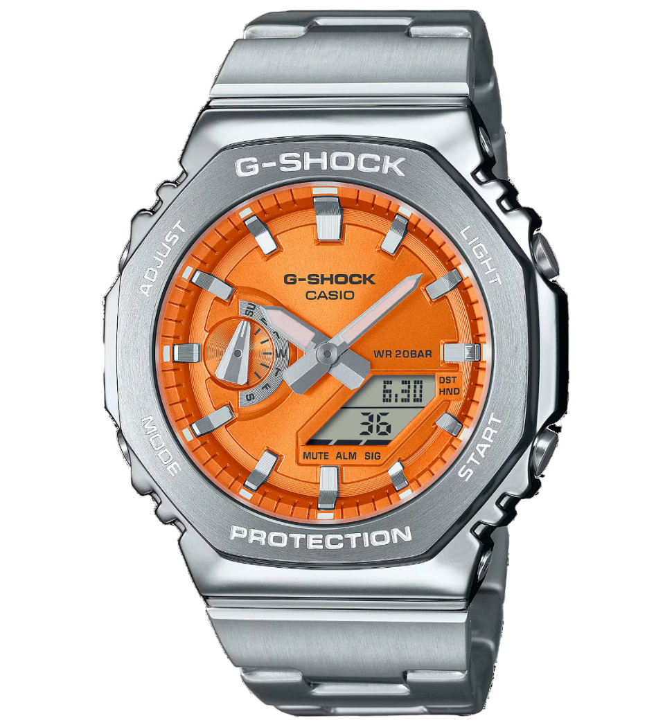 Apresentamos o GM-2110D, uma combinação digital-analógica G-STEEL baseada no sucesso do GA-2100, agora elevada com uma moldura de metal elegante que reforça sua presença sofisticada, mas totalmente resistente. Meticulosamente forjada e polida, a moldura octogonal entrega um visual marcante, moderno e versátil.