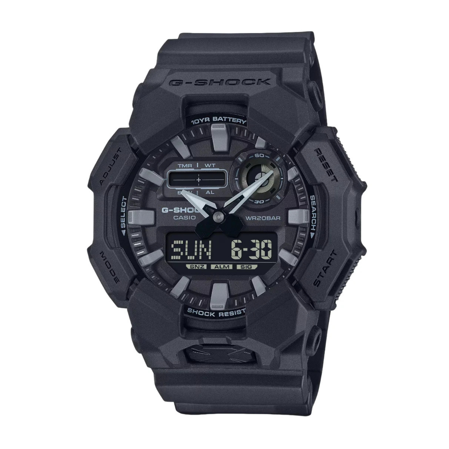 O G-Shock GA-010 traduz a robustez característica da linha em uma estética contemporânea inspirada em tons de campo, com sua caixa e pulseira em preto que evocam equipamentos táticos e ambientes extremos. O mostrador analógico-digital cria uma leitura dinâmica e funcional, combinando camadas e profundidade visual que reforçam sua identidade técnica, enquanto a presença marcante no pulso transmite imediatamente a essência utilitária e resistente da coleção.