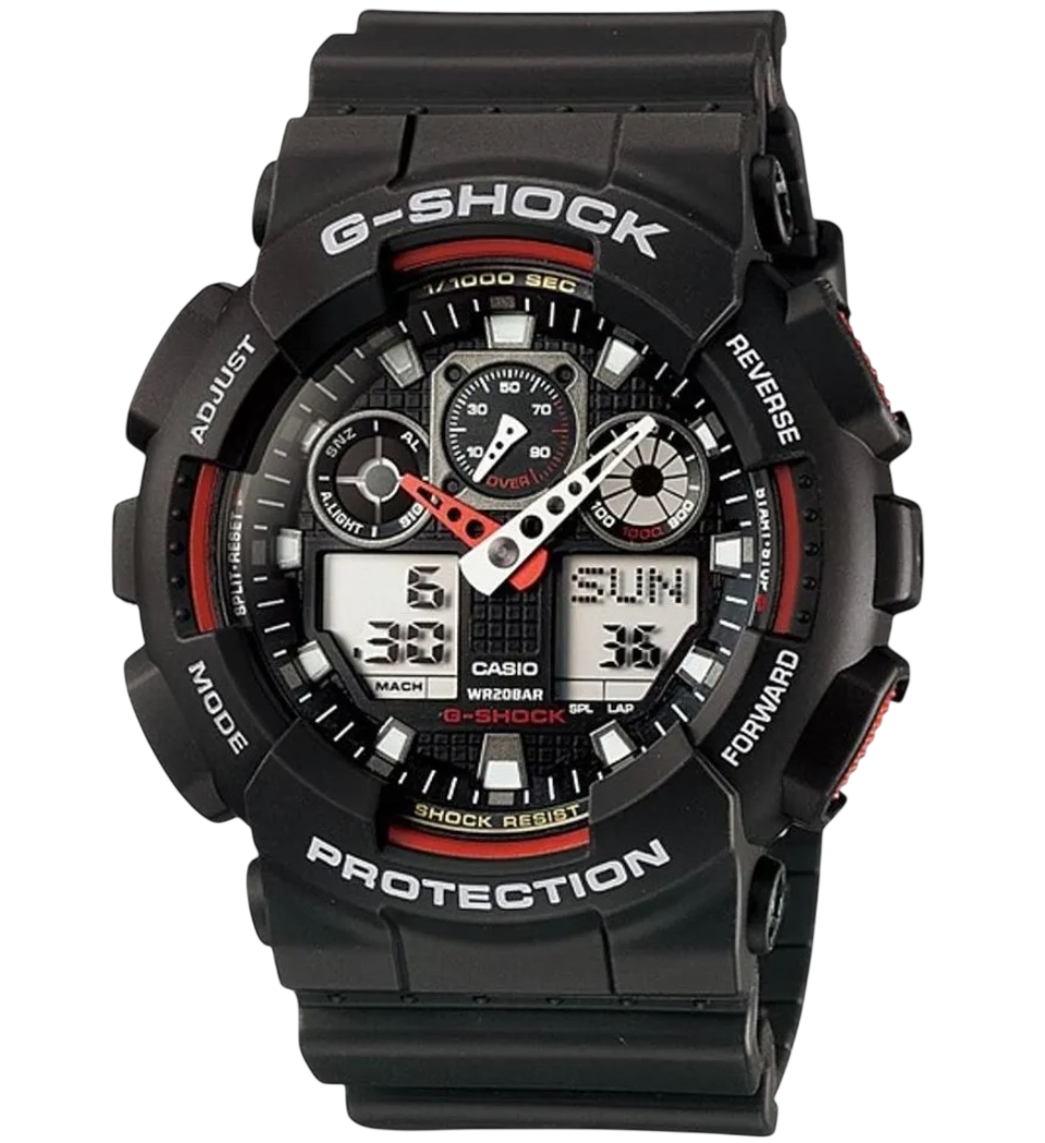 O G-Shock GA-100 combina presença urbana com a força característica da linha G-SHOCK, trazendo um design que mescla visor analógico e digital em uma estética robusta e imponente. Seu acabamento all black reforça o visual esportivo, enquanto o mostrador amplo com quatro janelas LCD mantém a identidade marcante do modelo.