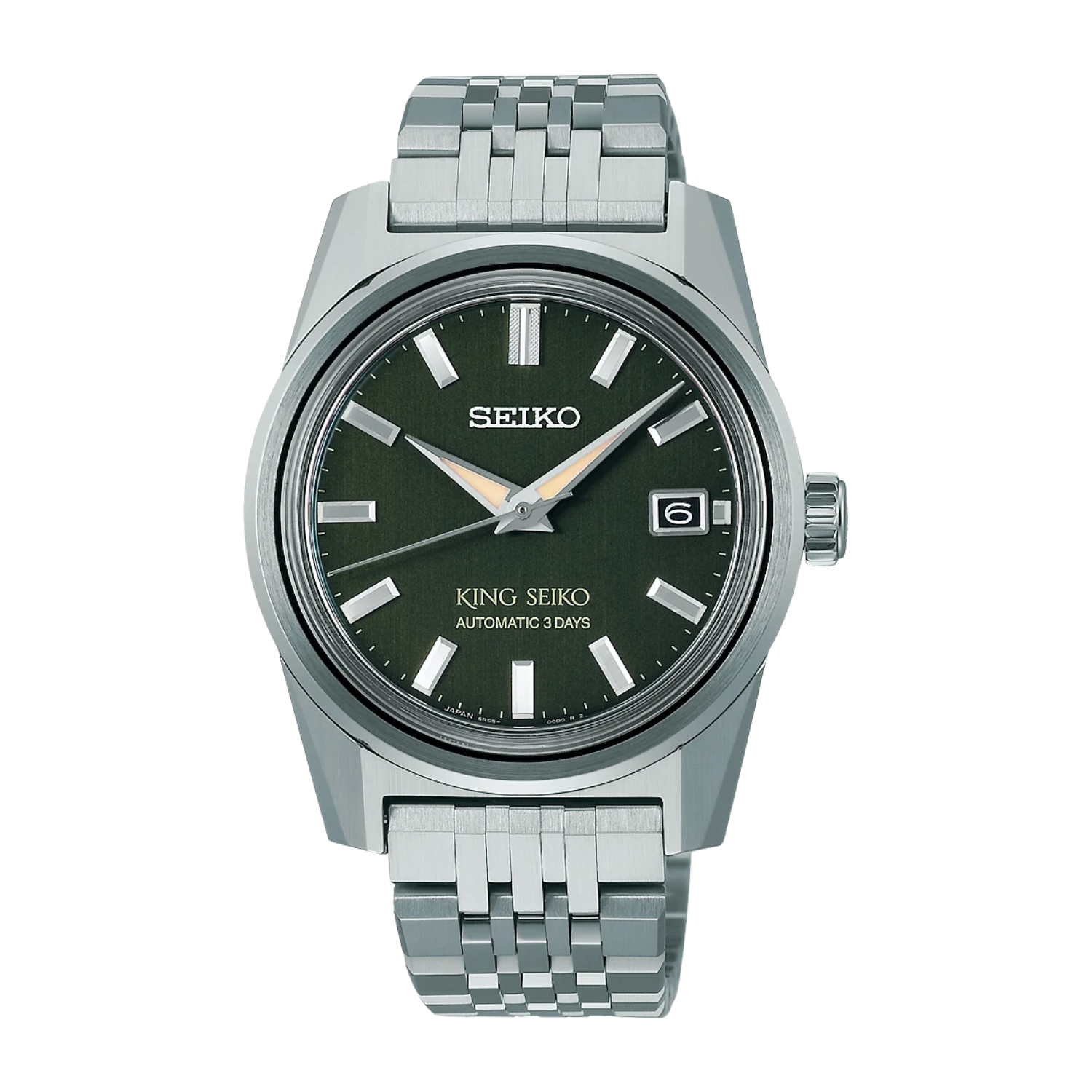 Seu mostrador verde oliva apresenta um acabamento hairline vertical que captura a luz de maneira sutil e sofisticada, evocando o refinamento dos modelos clássicos das décadas de 1960 e 70. A tonalidade profunda dialoga com a caixa de superfícies angulares e bem definidas, característica marcante do estilo King Seiko, enquanto os ponteiros facetados e índices aplicados reforçam a leitura limpa e precisa. O conjunto transmite uma elegância silenciosa, onde cada detalhe é pensado para expressar equilíbrio, tradição e um senso de sofisticação que dispensa excessos.