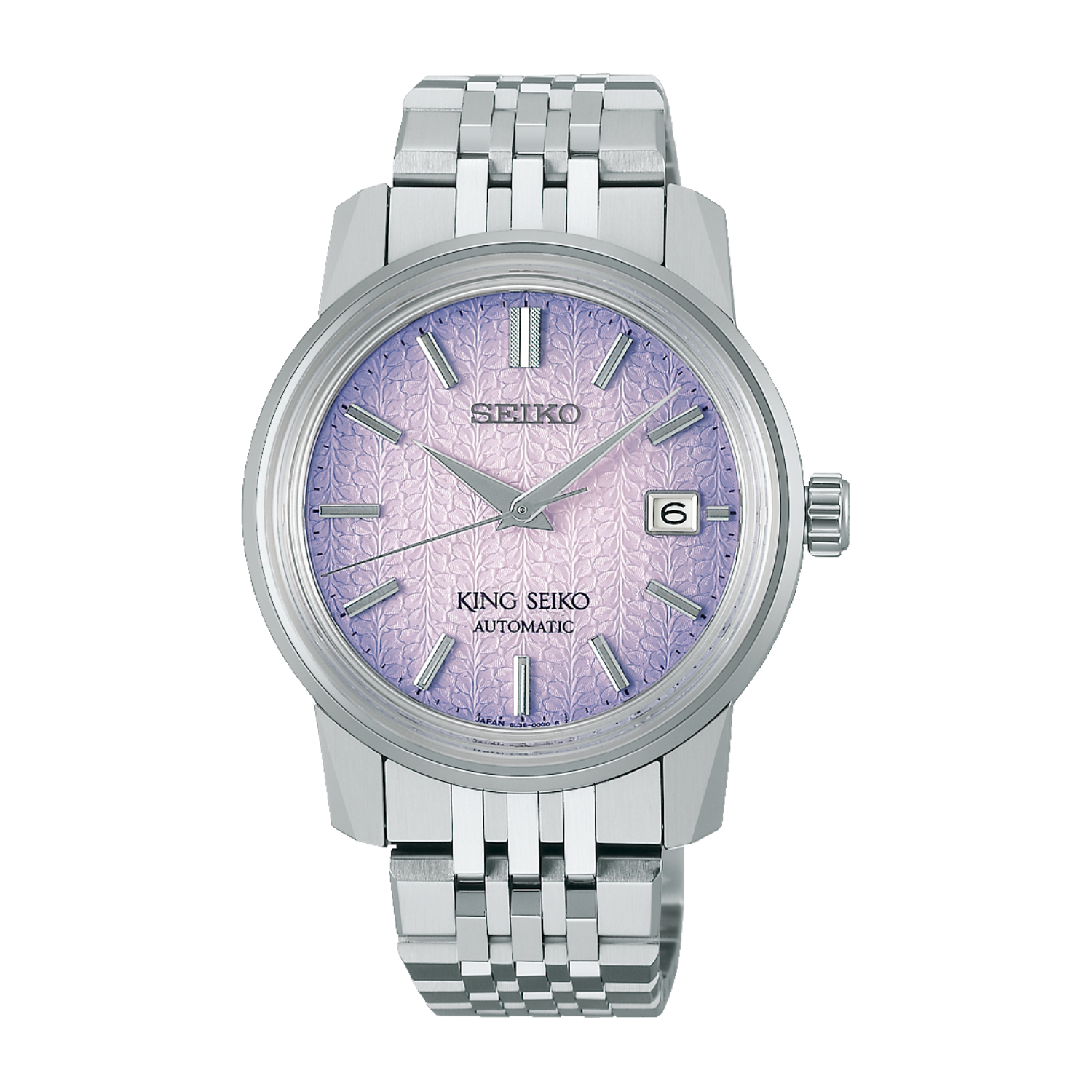 O grande protagonista está em seu mostrador “Tenjin-Fuji Violet”, onde tons de lavanda e violeta se encontram em um degradê profundo e envolvente. A textura, inspirada nas flores de glicínia do Santuário Kameido Tenjin, revela um padrão orgânico que ganha vida conforme a luz percorre sua superfície, criando um jogo visual sofisticado e dinâmico. Essa composição remete à estética do ukiyo-e, conectando o relógio à tradição artística japonesa que eternizou paisagens e elementos naturais ao longo dos séculos. Os índices facetados e os ponteiros Dauphine com acabamento Diamond Cut intensificam ainda mais esse espetáculo visual, refletindo a luz com extrema nitidez e proporcionando uma leitura elegante e precisa. A moldura delicada da janela de data complementa o conjunto com discrição, mantendo a harmonia do dial sem interferir em sua profundidade estética. No interior, o calibre automático 6L35 — um dos movimentos mais finos da Seiko — reforça o caráter técnico do modelo, oferecendo precisão refinada e uma experiência mecânica à altura de sua estética.