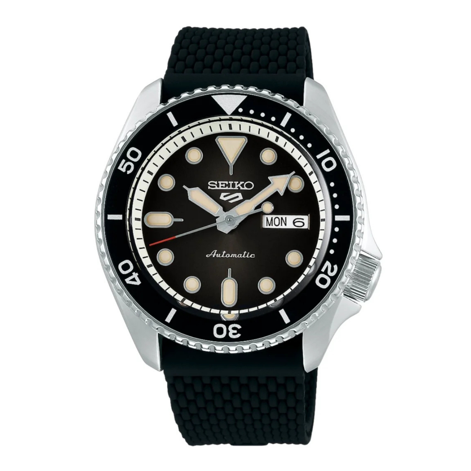 Parte da icônica coleção Seiko 5 Sports, este modelo mantém os cinco atributos que consagraram a linha desde 1963: movimento automático confiável, resistência à água, coroa protegida, caixa robusta e pulseira durável. Index e ponteiros com material luminoso, com a tecnologia LumiBrite da Seiko, garantem excelente legibilidade em qualquer ambiente, reforçando sua vocação prática e esportiva.