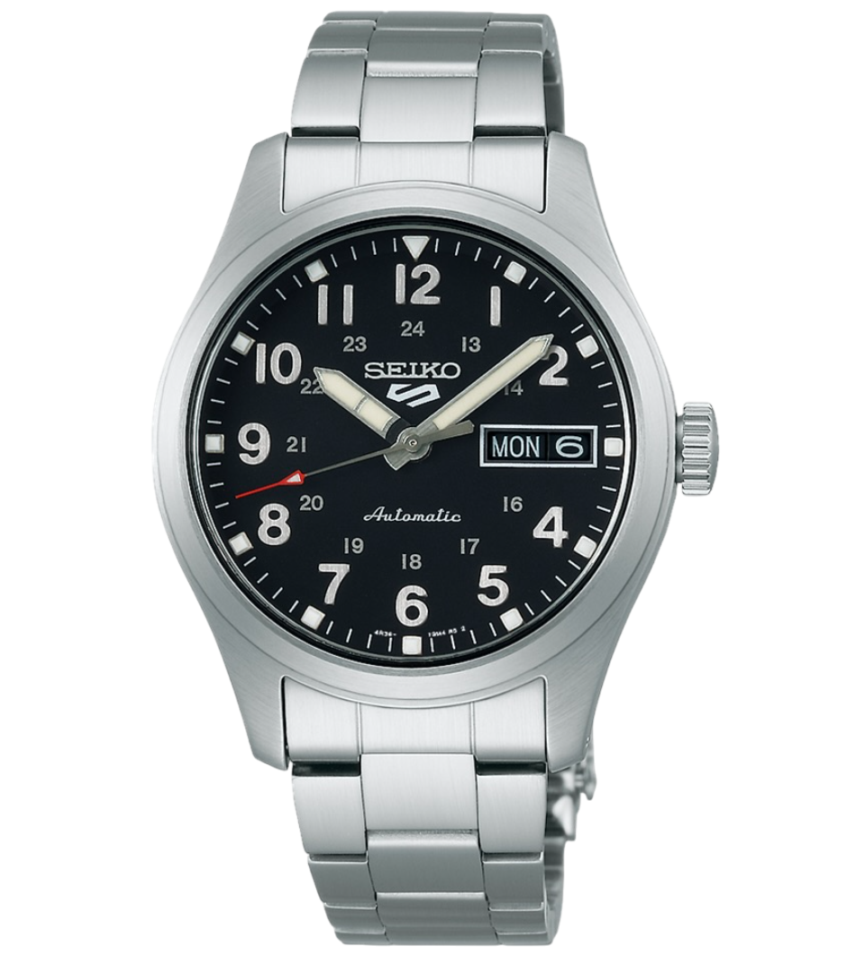 O Seiko 5 Sports Midfield SRPJ81 carrega a herança dos tradicionais field watches, relógios criados originalmente para uso militar com foco em legibilidade, resistência e praticidade. Em sua versão Reduced, apresenta caixa de 36.4 mm, oferecendo proporções clássicas e confortáveis, ideais para quem busca um modelo mais compacto sem abrir mão da presença robusta da linha Seiko 5.