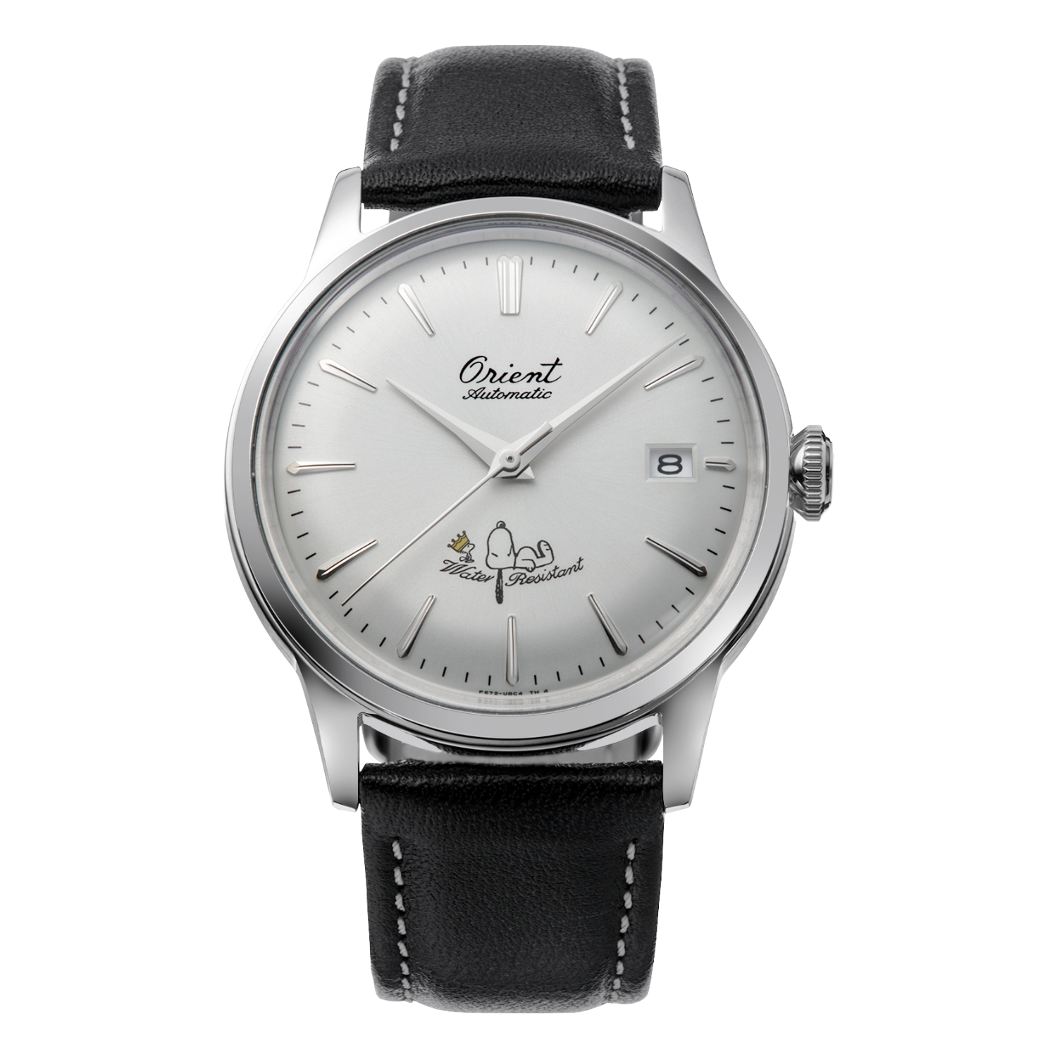 O Orient Bambino Peanuts 75th Anniversary RA-AC0M16S30B, celebrando os 75 anos de Peanuts, traz um mostrador branco minimalista que destaca Snoopy em sua pose clássica, enquanto Woodstock aparece com uma coroa dourada. O logotipo original da Orient surge em letras cursivas às 12 horas, reforçando o charme nostálgico desta edição especial.