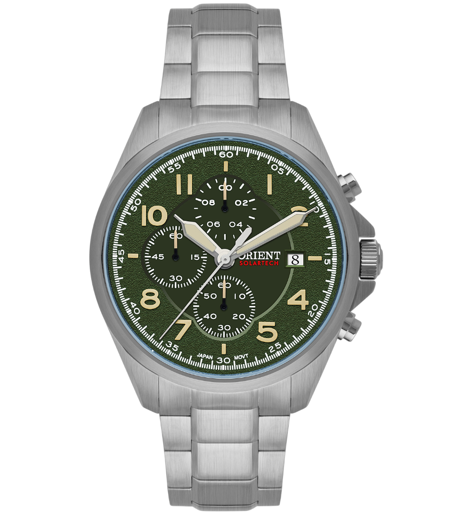 O Relógio Orient Solartech Elite Land MBSSC302 E2SX une estilo e tecnologia solar em um design contemporâneo, com mostrador verde e detalhes prateados que ressaltam a sofisticação. Seu funcionamento movido à luz garante autonomia e praticidade, sem necessidade de troca de bateria.