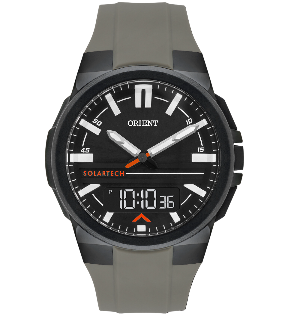 O Orient MPSPA010 traz um visual esportivo e contemporâneo que combina robustez, praticidade e estilo. Com caixa de 46 mm e mostrador preto de leitura clara, o modelo incorpora o design moderno da linha Solar da Orient, criado para oferecer autonomia prolongada e uso descomplicado no dia a dia. A pulseira de silicone cinza reforça a proposta esportiva, trazendo conforto, leveza e forte presença estética.