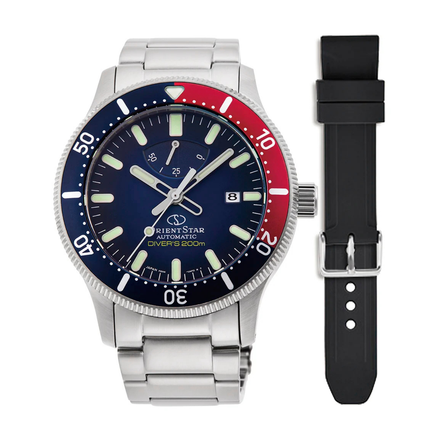 O Orient Star Diver's RE-AU0306L é um relógio que impõe respeito à primeira vista. Seu mostrador azul profundo transmite força, precisão e personalidade, enquanto a construção robusta deixa claro que este não é apenas um diver de aparência esportiva, mas um instrumento pensado para ambientes exigentes. O bezel unidirecional reforça sua vocação profissional, com destaque para o PIP posicionado de forma mais rebaixada em relação ao aro, um detalhe funcional e sofisticado que protege o marcador e evidencia o cuidado construtivo típico da linha Orient Star.