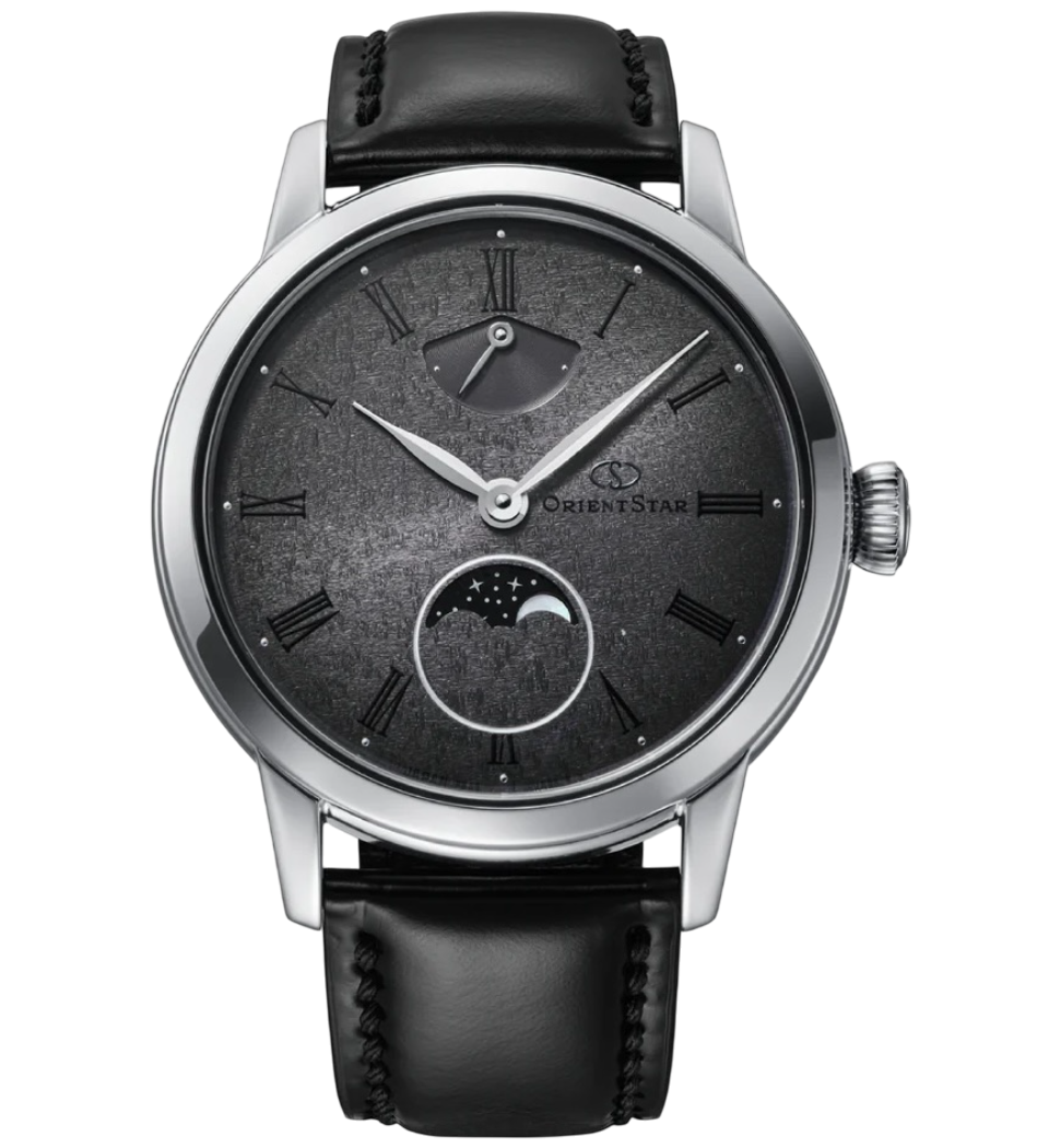 O Orient Star Moon Phase RE-BW0005N é uma criação rara e profundamente simbólica, limitada a apenas 140 unidades produzidas no mundo, concebida para representar a beleza do infinito e a relação ancestral entre o homem, o tempo e o céu noturno. Seu mostrador cinza em gradação monocromática cria um efeito hipnótico, escurecendo suavemente em direção às bordas criando a sensação de profundidade do céu noturno. Os marcadores recebem pontos luminosos delicados, distribuídos como estrelas, em referência direta ao aglomerado estelar das Plêiades — conhecido como Messier 45 — detalhe eternizado pela gravação “M45” no caseback. Os índices finos em algarismos romanos, executados em preto brilhante, reforçam a elegância clássica do conjunto, criando contraste sutil com o fundo texturizado e acrescentando uma leitura refinada, quase poética.