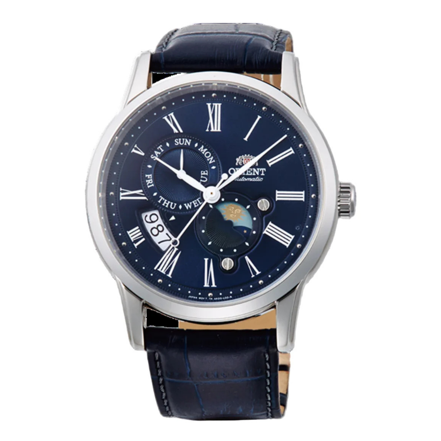 O Orient Sun & Moon RA-AK0011D30B pertence à geração clássica dessa coleção, marcada pelo design mais tradicional e pela poesia da complicação que alterna o Sol e a Lua ao longo de 24 horas. Inspirada em relógios europeus do século XIX, essa indicação dia/noite evoluiu para se tornar um dos elementos mais emblemáticos da Orient, unindo simbolismo, cultura e estética em uma única peça. Nesta versão, o mostrador azul profundo contrasta perfeitamente com ponteiros e índices brancos, texturas e subdials equilibrados que consolidaram o visual mais conhecido da linha.