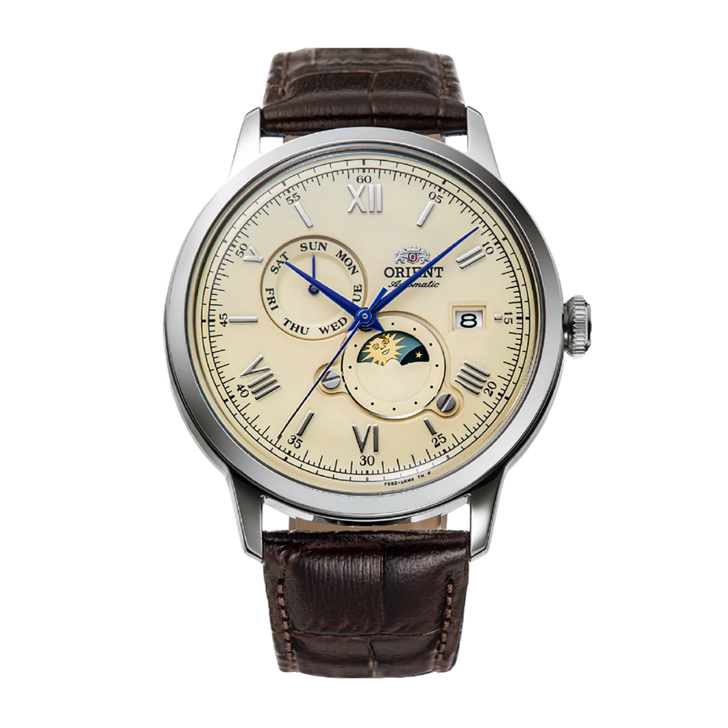 Nesta versão, o mostrador creme dialoga perfeitamente com os ponteiros azuis, enquanto os índices prateados adicionam sobriedade ao mostrador. O detalhe do disco assimétrico do Sol e da Lua entre dois parafusos traz referências modernas a uma silhueta tão clássica. O layout equilibrado incorpora ainda o calendário completo, resultando em uma peça que une tradição relojoeira, simbolismo histórico e estética moderna em perfeito equilíbrio, um clássico contemporâneo da Orient.