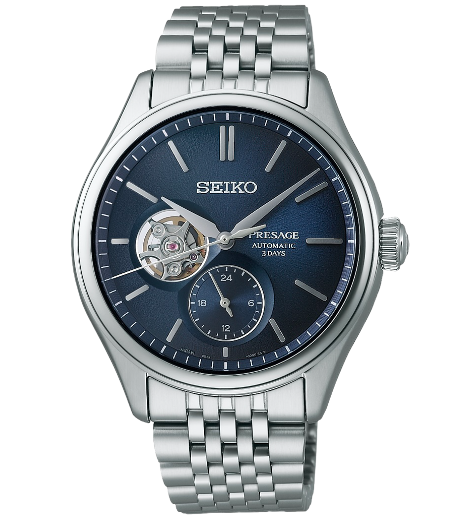 Seu mostrador azul profundo, conhecido como “Ai-iro”, resgata uma cor tradicional japonesa que transmite sobriedade e elegância atemporal. O design revela um coração aberto posicionado às 9 horas, permitindo contemplar o movimento vivo em ação, enquanto um submostrador de 24 horas posicionado às 6 horas adiciona equilíbrio e funcionalidade ao conjunto. Ponteiros e índices prateados reforçam a harmonia visual, protegidos pelo cristal de safira de curva dupla que garante profundidade e nitidez. No interior, pulsa o calibre automático 6R5J, que oferece precisão e impressionante reserva de marcha de 72 horas.