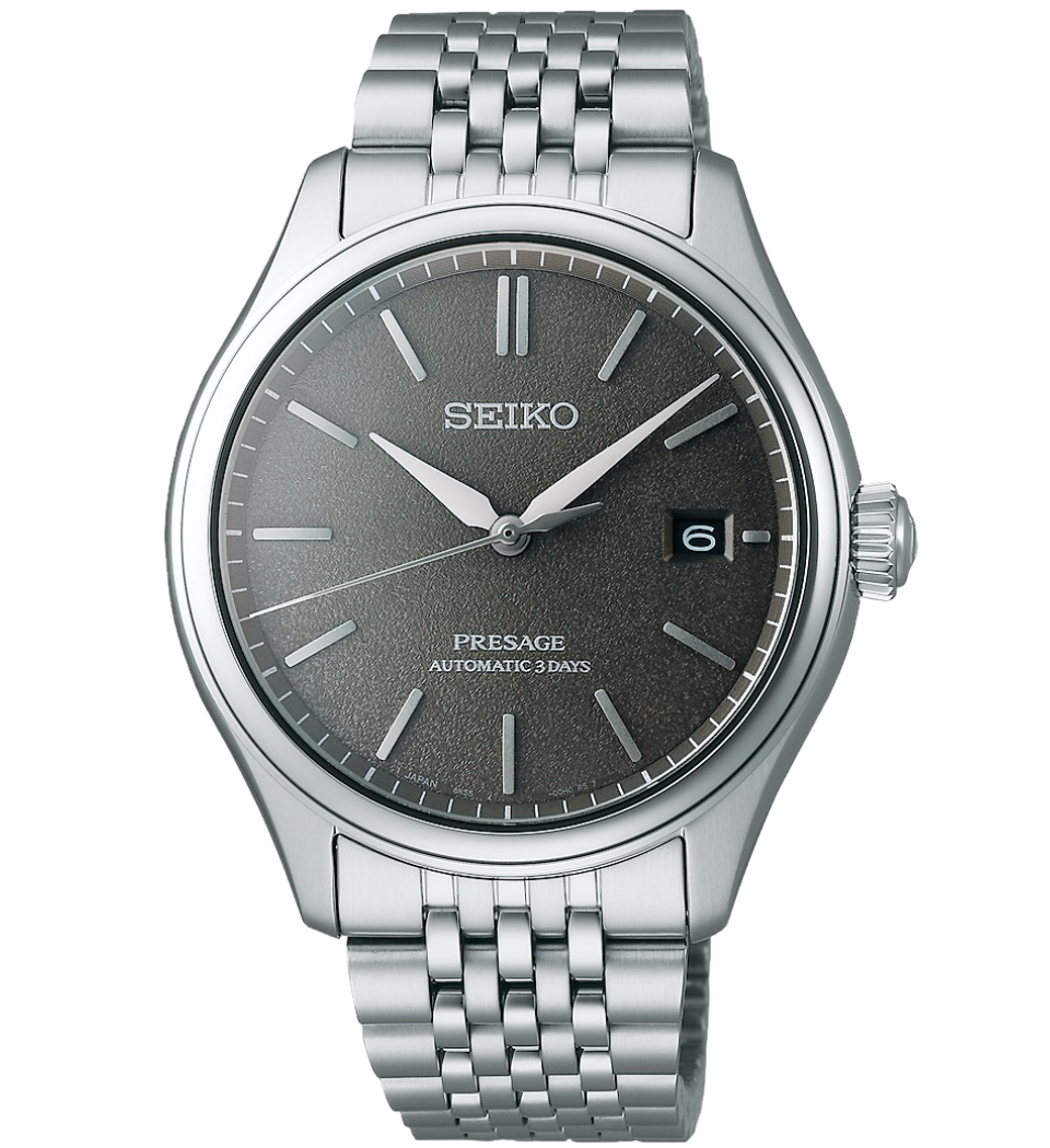 Os ponteiros prateados e os index curvos criam harmonia sob o cristal de safira curvo. A pulseira metálica com elos curtos de 6.0 mm garante brilho refinado e conforto no pulso. Equipado com o calibre automático Seiko 6R55, oferece 72 horas de reserva de marcha e a precisão confiável da relojoaria japonesa.