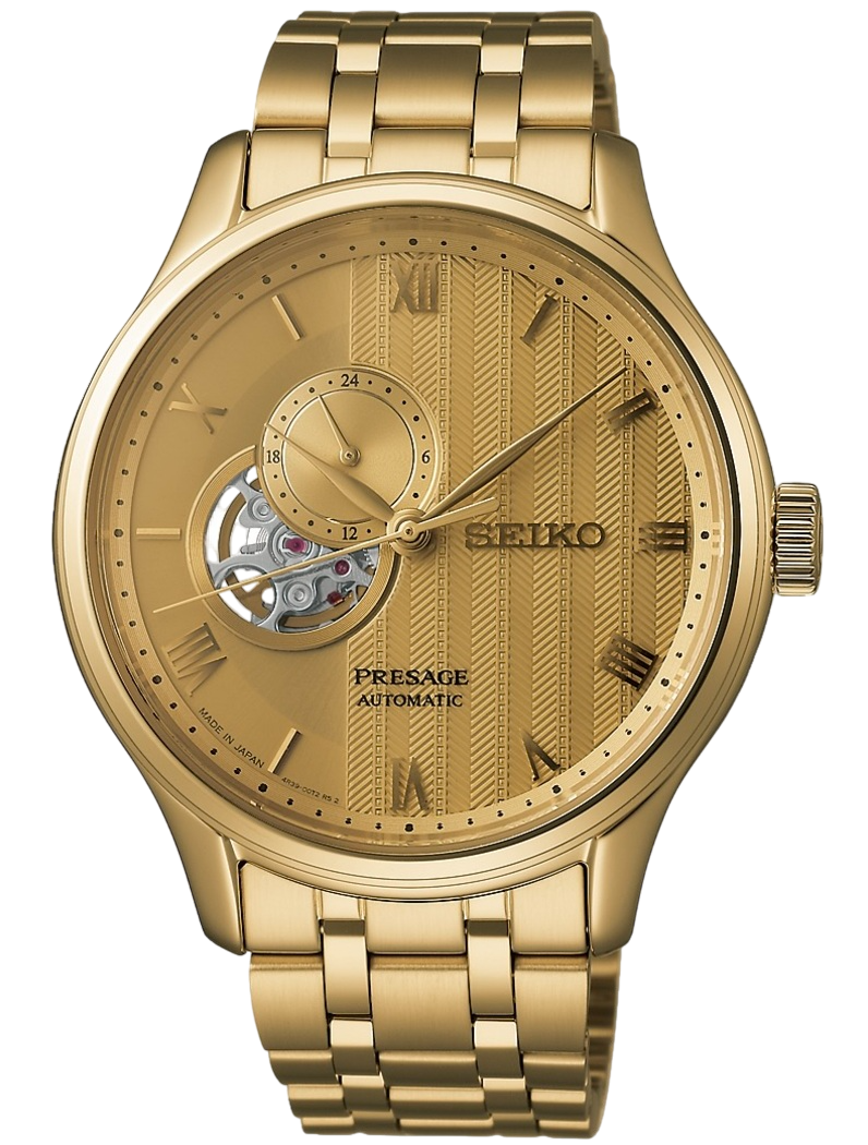 O Seiko Presage Zen Garden SSA468 celebra a elegância atemporal dos jardins japoneses, inspirado na era dourada de Kyoto, período entre os séculos XIV e XVII em que a cidade era capital do japão e floresceu como centro cultural do país. Inspirado na atmosfera contemplativa japonesa, seu mostrador dourado reflete a espiritualidade da época. A textura evoca os padrões da areia rastelada, símbolo japonês da beleza efêmera da vida, da renovação e da serenidade diante do tempo.