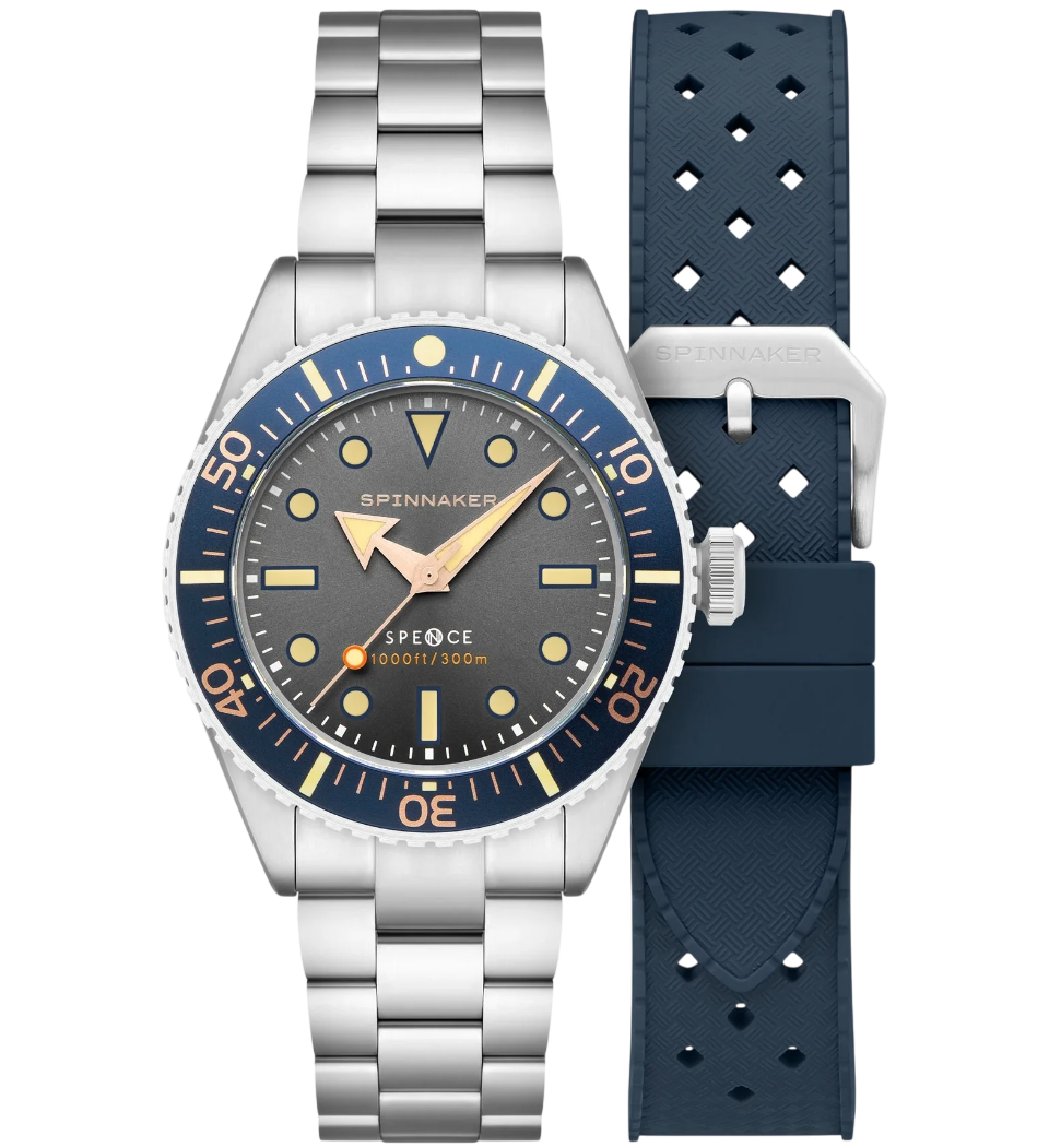 O Spence 300 SP-5097-77 é um relógio que une engenharia de precisão e design refinado. Com apenas 10,9 mm de espessura, este modelo automático oferece resistência à água de até 30 ATM ou 300 m. Seu mostrador cinza, combinado com caixa e pulseira de aço inoxidável, além de pulseira extra em borracha, proporciona versatilidade e sofisticação para diversas ocasiões.