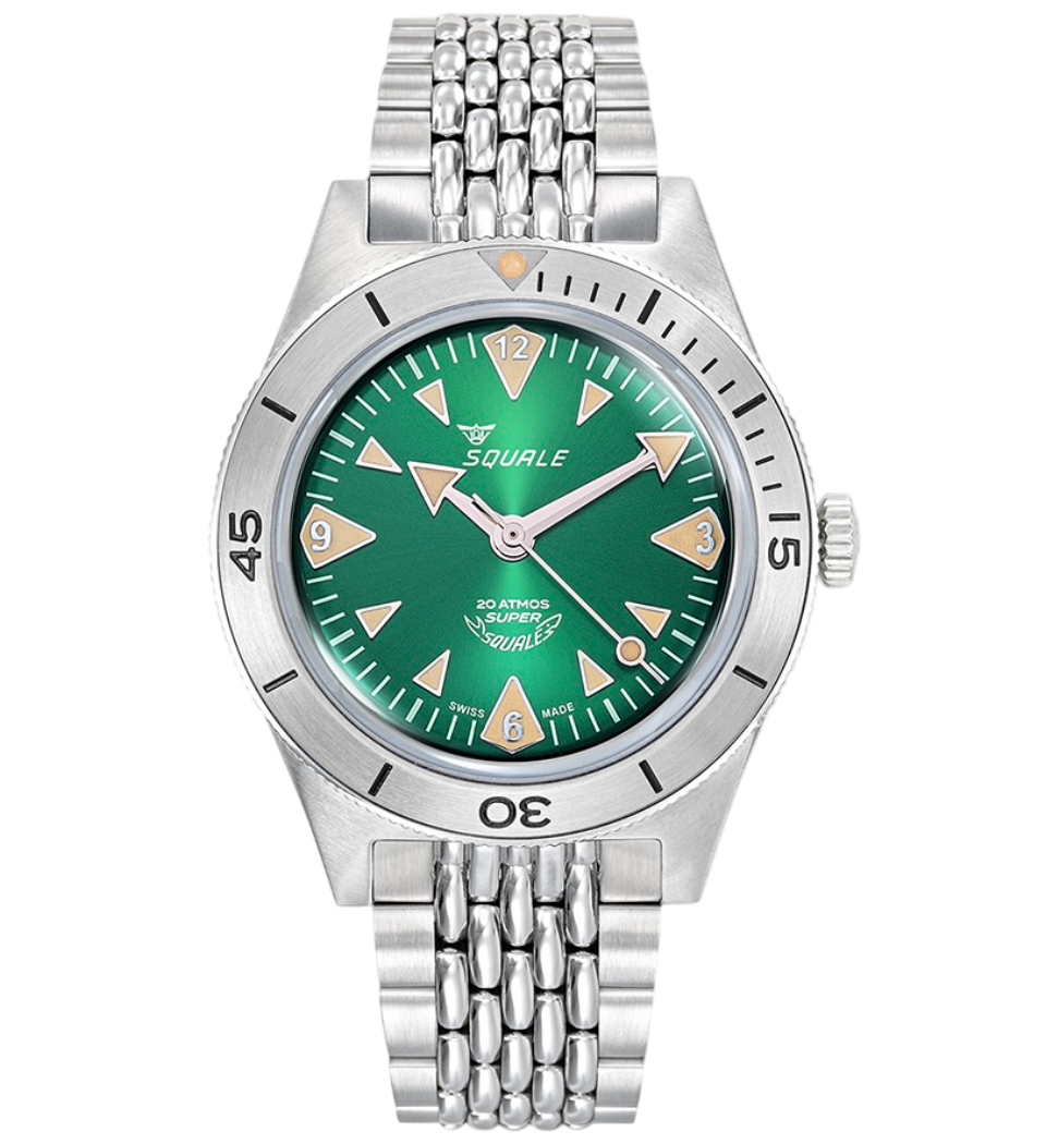 Com design clássico e espírito de aventura, o Super Squale SUPERSSAGR.AC resgata a essência dos modelos icônicos dos anos 60. Com mostrador verde vibrante e acabamento refinado, é ideal para quem busca tradição e personalidade em um relógio de mergulho. Sua construção em aço inoxidável garante resistência e estilo atemporal.