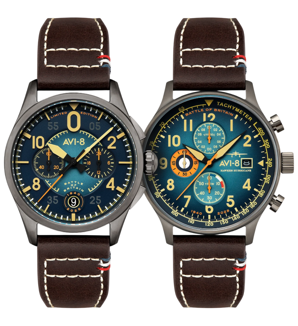Para celebrar o 85º aniversário da histórica Batalha da Grã-Bretanha, a AVI-8 apresenta o conjunto Hawker Hurricane e Spitfire Limited Edition AV-BOB85-SETA, uma homenagem dupla à coragem e precisão da aviação britânica. Limitado e enumerado a apenas 150 conjuntos que unem dois cronógrafos inspirados nos lendários caças que dominaram os céus durante a Segunda Guerra Mundial.
