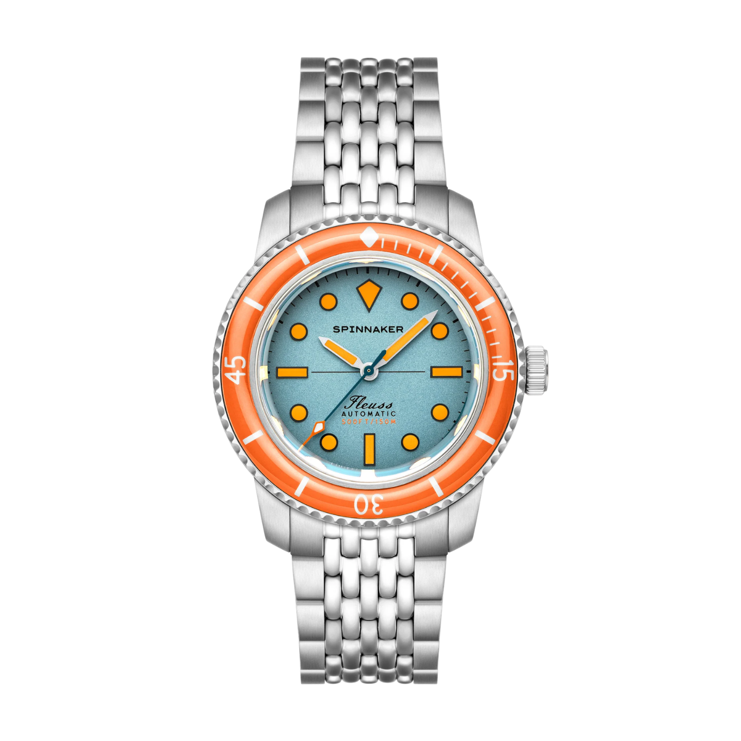 A coleção Fleuss incorpora essa história em um design robusto e funcional, com forte identidade de mergulho. O bezel unidirecional reforça sua proposta técnica, em laranja vibrante cria um contraste marcante com o mostrador em tom azul esverdeado de acabamento acetinado e estética vintage com alto contraste, que proporciona leitura clara e imediata, e evoca as nuances do oceano iluminado pelo pôr do sol. A caixa refinada em proporções equilibradas traz conforto ao pulso, sem abrir mão da presença marcante, criando um equilíbrio entre tradição e modernidade. Cada detalhe do modelo reflete a conexão com o universo subaquático, tornando-o uma peça que conversa diretamente com colecionadores e entusiastas que valorizam história e propósito no pulso.