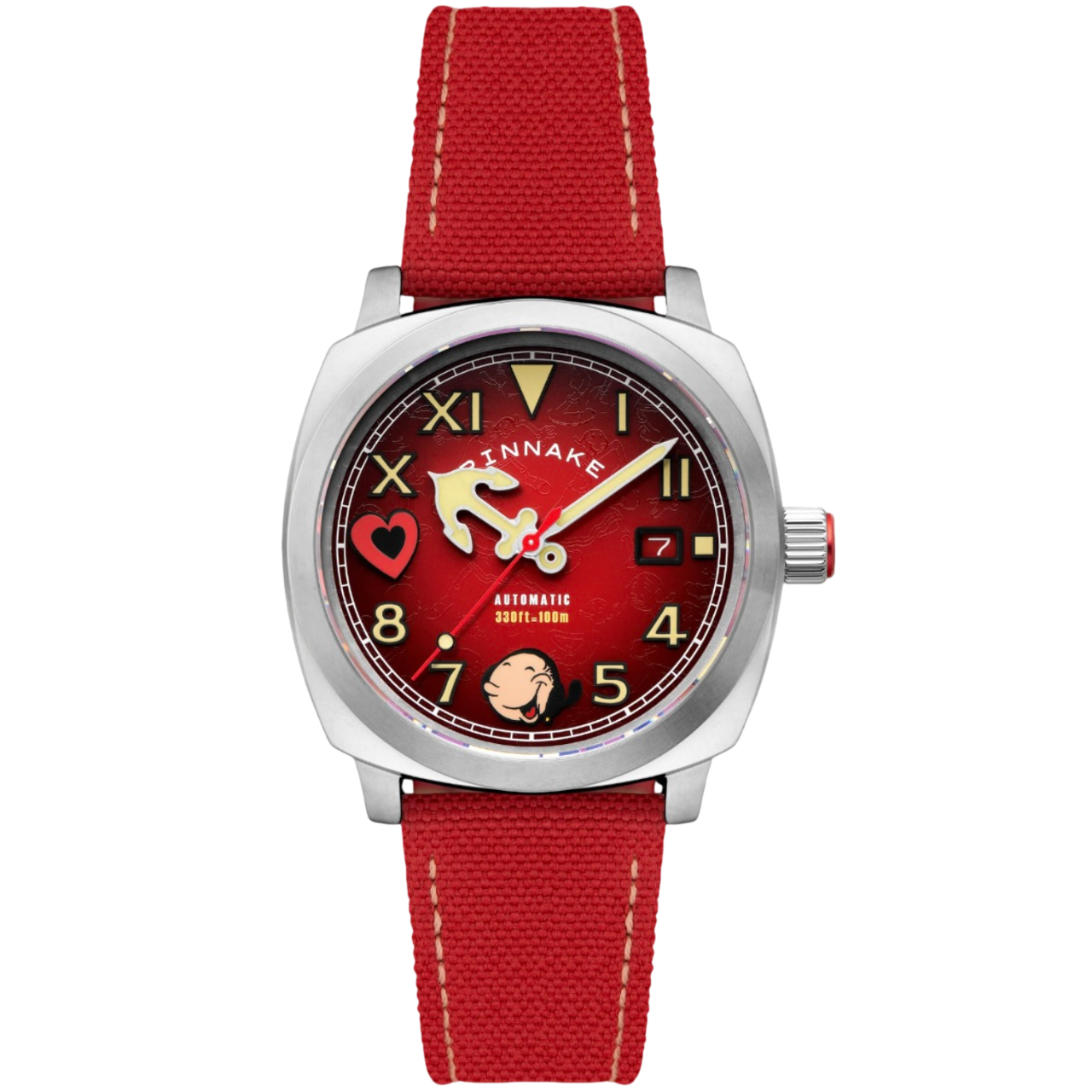 O Spinnaker Hull Olívia Palito Limited Edition SP-5169-02 celebra o romance lendário de Popeye e sua amada de longa data Olívia Palito em uma edição limitada a apenas 300 peças. O mostrador vermelho entrega impacto imediato no pulso e traduz a energia divertida da colaboração, com um visual que mistura charme, coragem e espírito de alto mar em uma leitura apaixonante.
